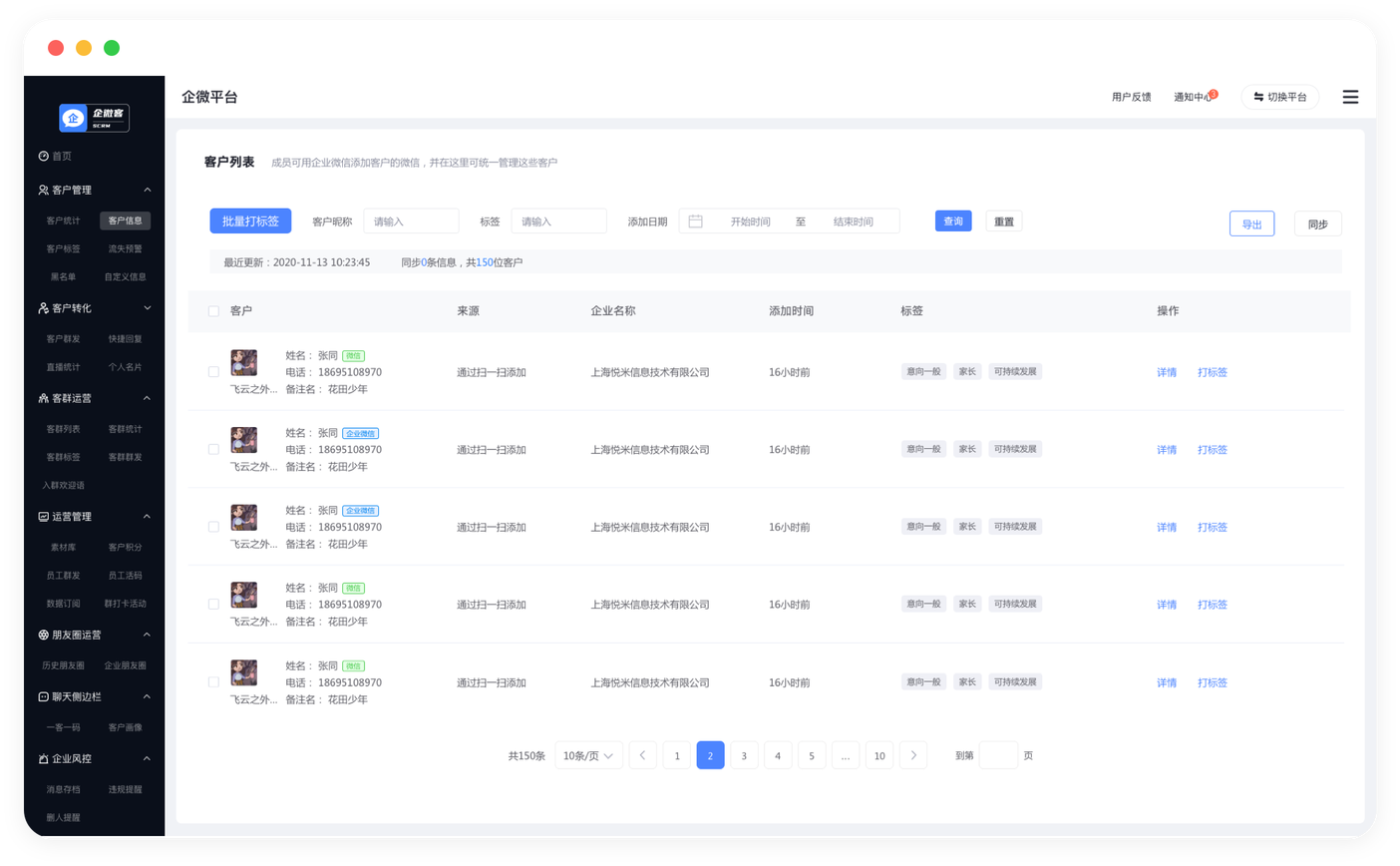 批量添加好友,备注标签自动同步;员工二维码自动分流,自定义欢迎语,给客户自动打标签