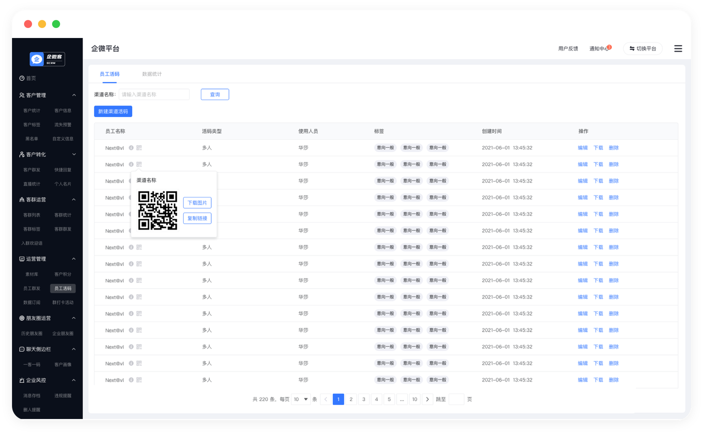 提供员工活码、客户群活码、区域活码等快速搭建企业私域客户池