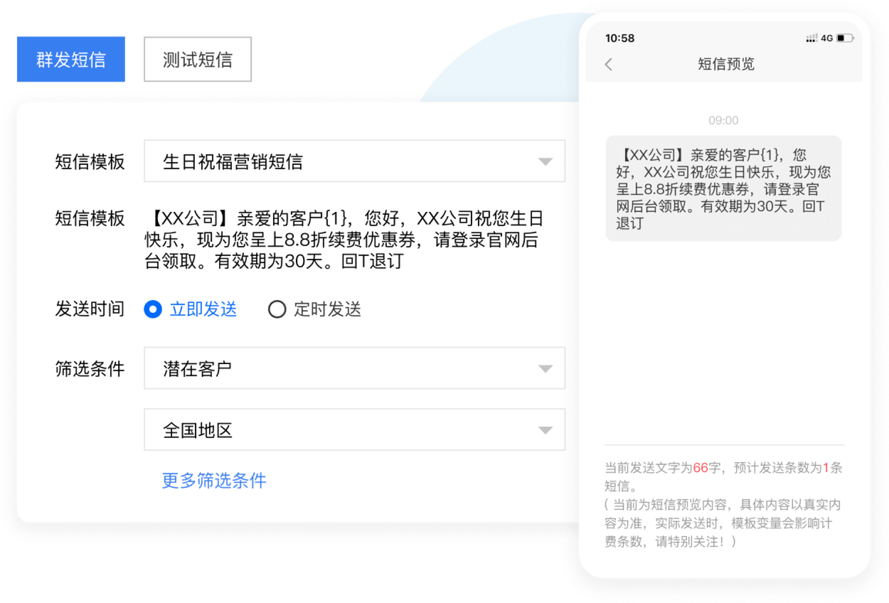 发送用户关怀、节日问候、新品上线、产品促销、折扣送券、业务推广、活动邀请等运营/营销短信,支持精准触达全球用户