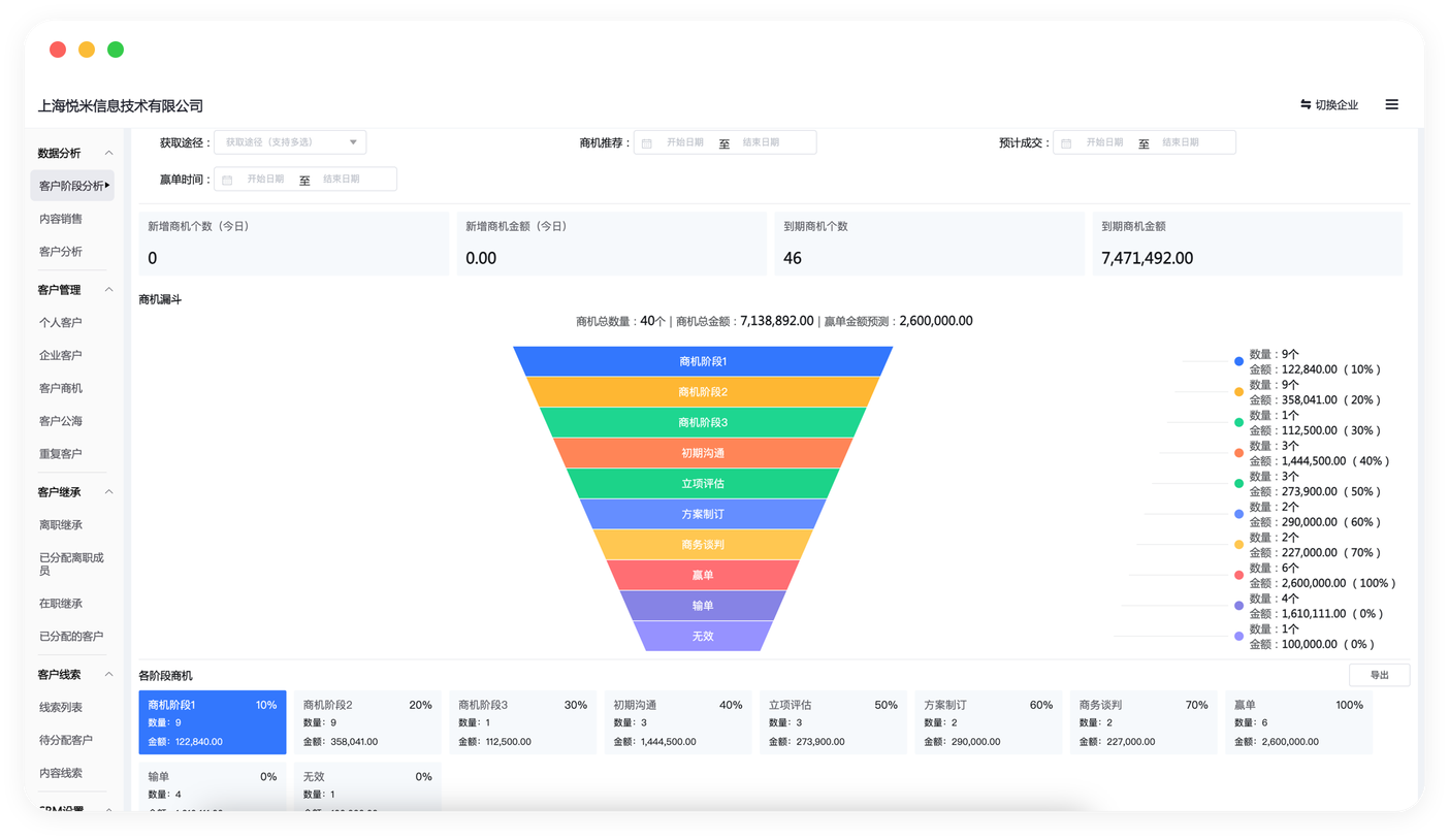 对销售行为、成交数据进行统计分析,帮助销售了解目标完成度、业务水平,激发潜力;帮助管理者了解销售行为,寻找决策方向。