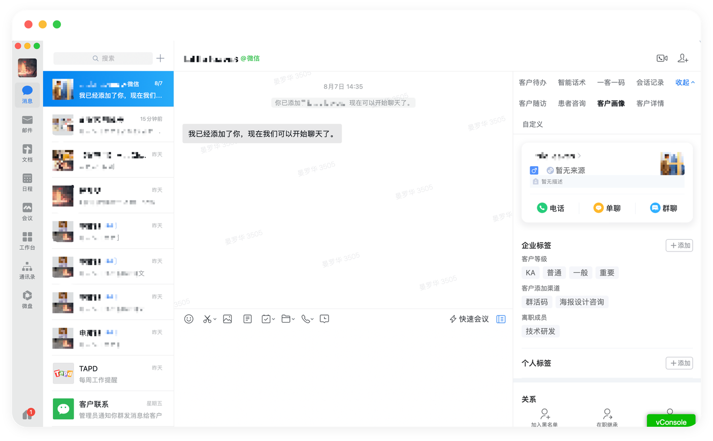 ·在外部会话中可快捷添加外部联系人到CRM中,并添加与该联系人的往来和查看往来历史,使企业有效提高服务效率